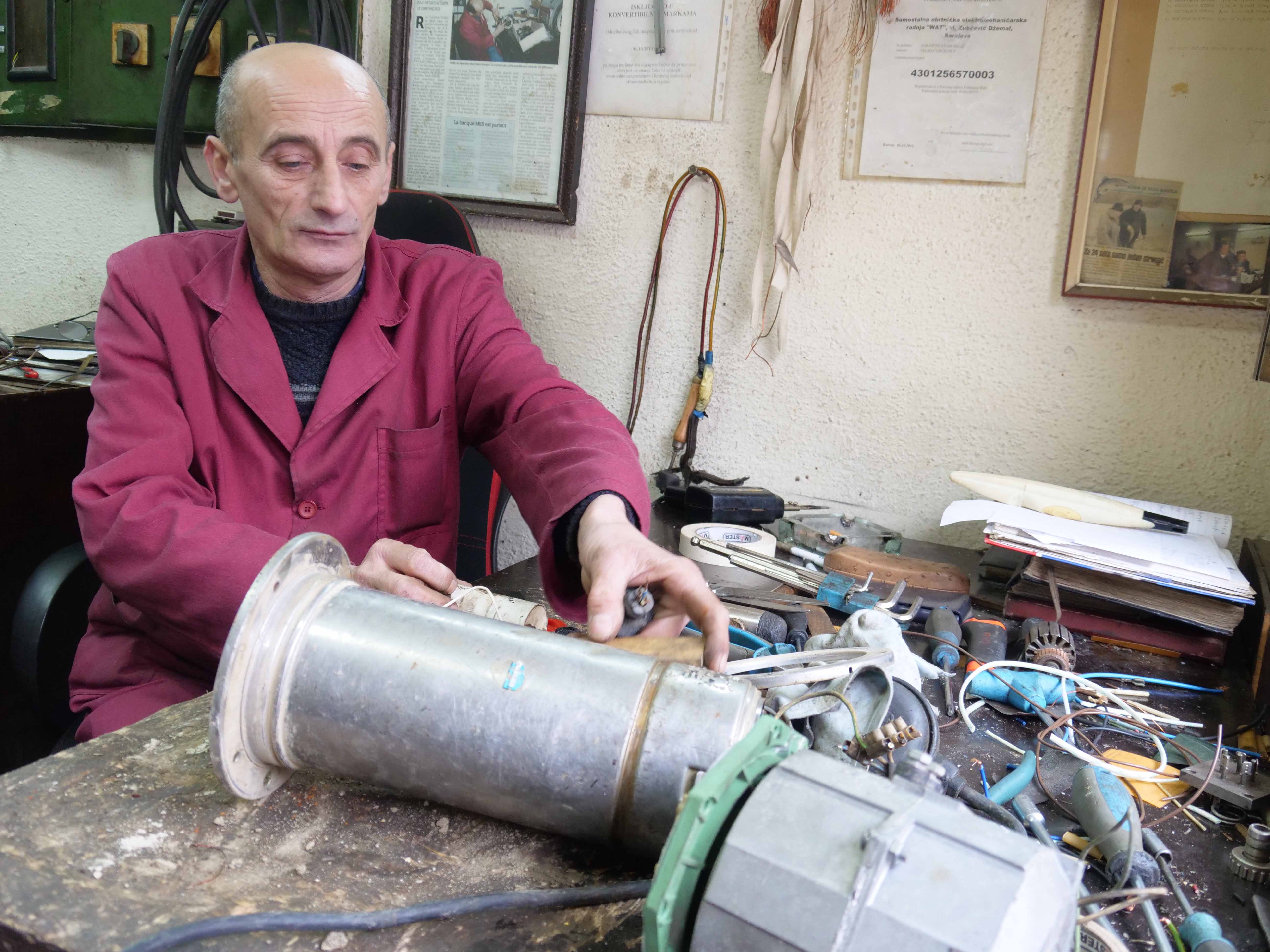 “Stari se namotaji skinu, a zatim se stavljaju novi, bakarni. Elektromotori su ugrađeni svuda, od pumi za grijanje, pumpi za otpadne vode, pumpi za podizanje pritiska, ventilatora, klima sistema, do veš mašine. Sve što se okreće ima elektromotor. Sada se prave i automobili na struju, tako da i u njima ima elektromotora. Posla ima i biće ga još dugo” – kaže Džemal.