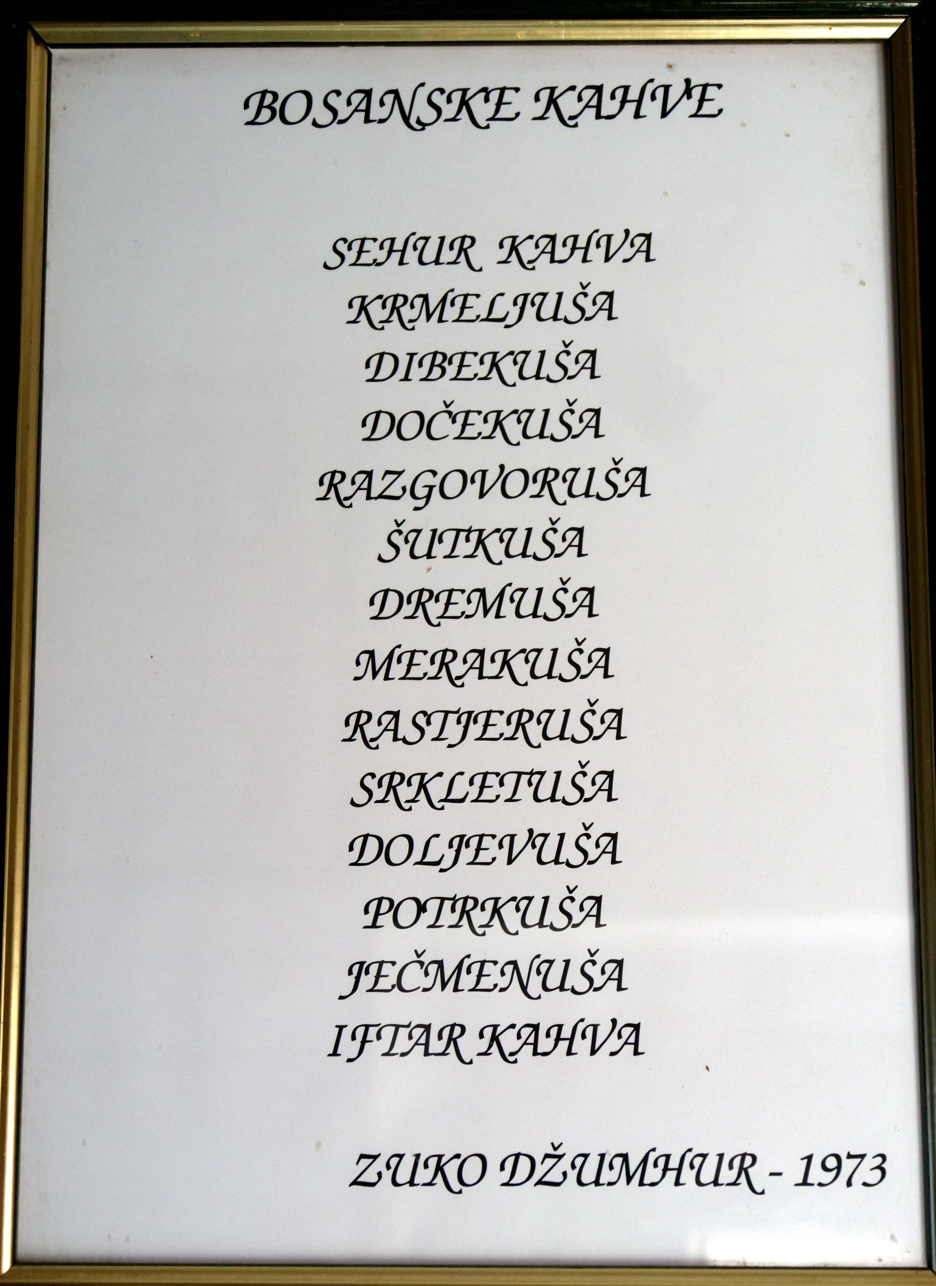 “Tucana kahva je nešto specifično. To je jedan stari način prozvodnje. Kada nije bilo mlinova, koristili su se ovi dibeci, kao što je ovaj moj od rahmetli dede. Ubaci se prženo zrno u dibek i ovom ćuskijom koja je stara kao i dibek preko 150 godina, se tuca kahva. Teška je 13 kila i kovana je u kovačnici. Za kilo kafe se treba 15 minuta tucati. Neko ko ne zna treba mu mnogo više. Meni i sinu ne treba teretana. Ovo je sasvim dovoljno” – kroz smijeh će Hajrudin.